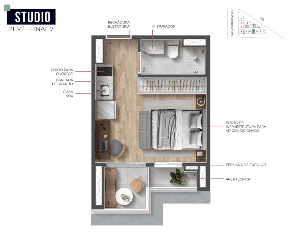 O imóvel situa-se no 8º andar e possui uma área privativa de 22 m², com área total de 32 m². A planta é configurada em formato de studio, otimizando a integração entre os ambientes.